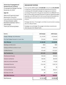 Please join us for our annual Budget Meeting, Sunday, November 23. Light nourishment and childcare is available in the lounge and narthex immediately after service, then we reconvene in the sanctuary to consider and vote on the 2026 church budget. The proposed budget is recommended by Church Council after being prayerfully developed by representatives of boards and committees. The budget reflects our values and aspirations as a beloved community, and the realities of available funding and resources. Bring your questions and be a part of this important conversation and action.